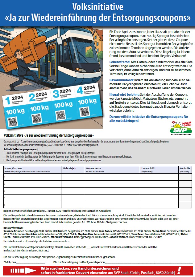 Bis Ende April 2025 konnte jeder Haushalt pro Jahr mit vier Entsorgungscoupons max. 400 kg Sperrgut in städtischen Recyclinghöfen entsorgen. Seither gibt es diese Coupons nicht mehr. Neu soll das Sperrgut in mobilen Recyclinghöfen zu bestimmten Terminen abgegeben werden. Die Anlieferung mit dem Auto ist verboten. Diese Regelung ist lebensfremd, bevormundend und belohnt illegales Verhalten!